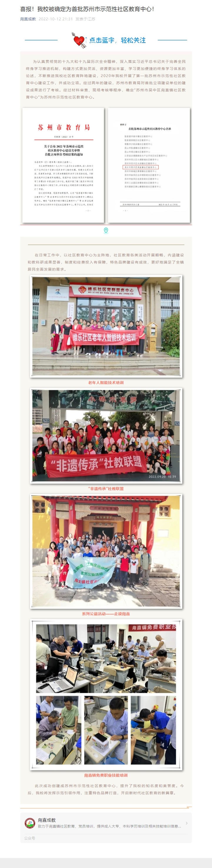 喜报!我校被确定为首批苏州市示范性社区教育中心!